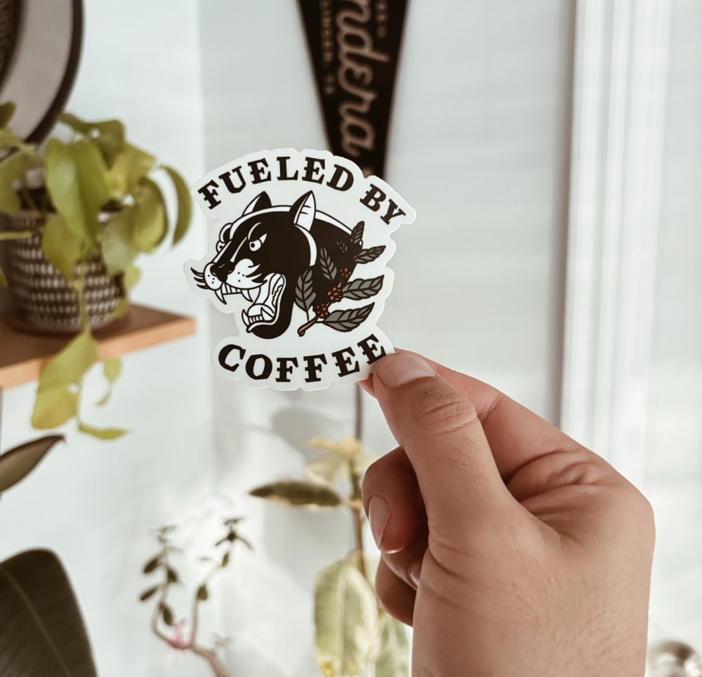 “Fueled by Coffee” Panther Head Sticker — a fierce fusion of bold energy and classic tattoo-inspired style. This striking design captures the untamed spirit of caffeine with a growling panther and vintage lettering that says it all: coffee keeps you running. Printed on durable matte vinyl, this sticker is perfect for your tumbler, laptop, car, or espresso machine. Built to last through every adventure (and every cup).
